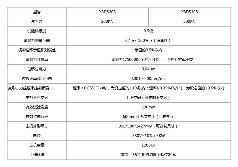產(chǎn)品型號(hào):XBD5205、XBD5305設(shè)備主要功能:本設(shè)備適用于對(duì)金屬材料、非金屬材料及復(fù)合材料的力學(xué)性能的測(cè)試以及工藝性能的分析研究。配上相應(yīng)的工裝,可做拉伸、壓縮、彎曲、剪切、撕裂、剝離、頂破、疲勞等試驗(yàn)。可自動(dòng)求取試驗(yàn)承受力值、斷裂力值、伸長(zhǎng)率、抗拉強(qiáng)度、屈服強(qiáng)度、抗壓強(qiáng)度、彈性模量、剪切強(qiáng)度、撕裂強(qiáng)度、剝離強(qiáng)度等參數(shù)。同時(shí)也可實(shí)現(xiàn)定伸長(zhǎng)應(yīng)力、定應(yīng)力伸長(zhǎng)、載荷保持等要求的測(cè)試。該機(jī)廣泛應(yīng)用于建筑建材、航空航天、機(jī)械制造、電線電纜、橡膠塑料、汽車制...">